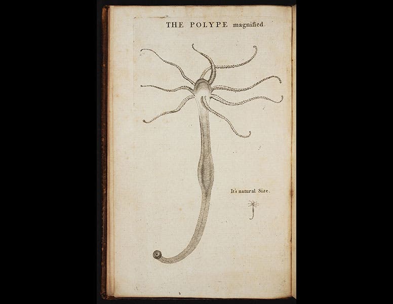 Henry Baker, an English microscopist, was born May 8, 1698. In 1740, a French naturalist, Abraham Trembley, had discovered that hydra (tiny organisms found in pond water, also called polyps), have astonishing regenerative powers. Cut them in half, crosswise or lengthwise, and the remaining half grows back, good as new. Most naturalists would have found this unbelievable at the time, so Trembley cleverly sent samples of his little beasties to many of the scientific societies of Europe, so that others could try the experiments for themselves. Baker latched onto the specimens that were sent to the Royal Society in London; he received the first one in the spring of 1743, and by November, he had a 220-page book ready for the press, An Attempt towards a Natural History of the Polype, and it beat Trembley’s own book into print by a full year. Baker gave Trembley credit for the discovery in his own book, but he still made a tidy penny from the sale of his work. We see above the frontispiece, showing a magnified polyp (first image), the title page, and a two-page spread, in which he illustrates the stages of regeneration after a polyp is cut in half (third image).
