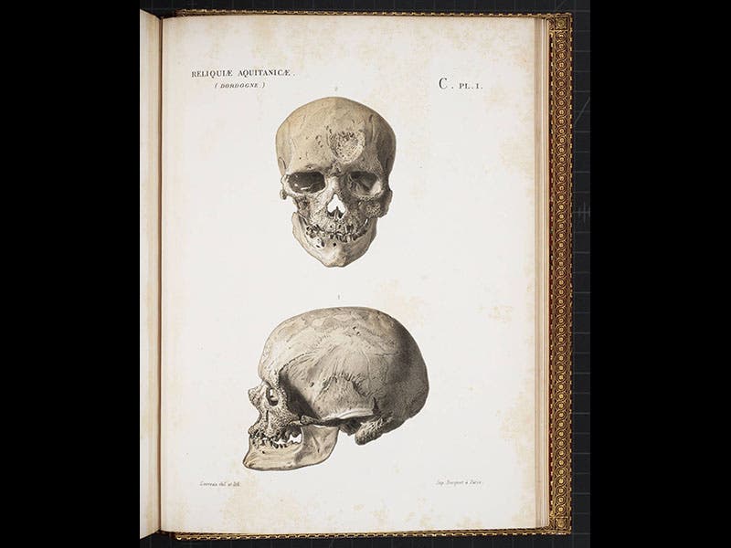 Christy never saw the celebrated Cro-Magnon specimen, discovered by Lartet’s son in 1868, in time for its portrait to be included in the Reliquiae Aquitaniae (fourth image). Christy’s own portrait bust is included as well, as a frontispiece and tribute (fifth image).