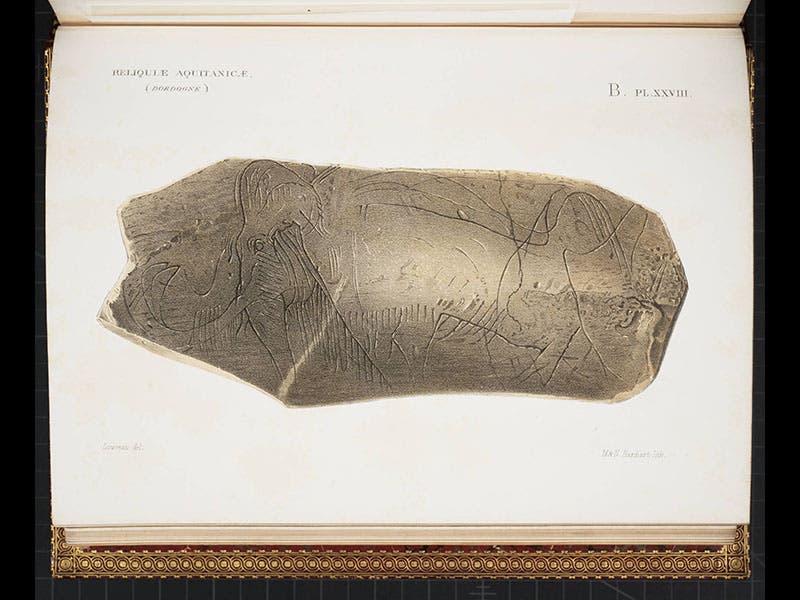 Christy died in 1865, but funding from his estate kept Lartet and his excavations going. Lartet himself died in 1871, but the project now had momentum, and in 1875, Reliquiae Aquitaniae emerged from the press, one of the most attractive books on archaeology ever published (third image). It is Christy’s most impressive legacy. We have a splendid copy in our History of Science Collection, and we displayed it in our 2012 exhibition, Blade and Bone: The Discovery of Human Antiquity, where the lovely La Madeleine mammoth graces the exhibition title page.