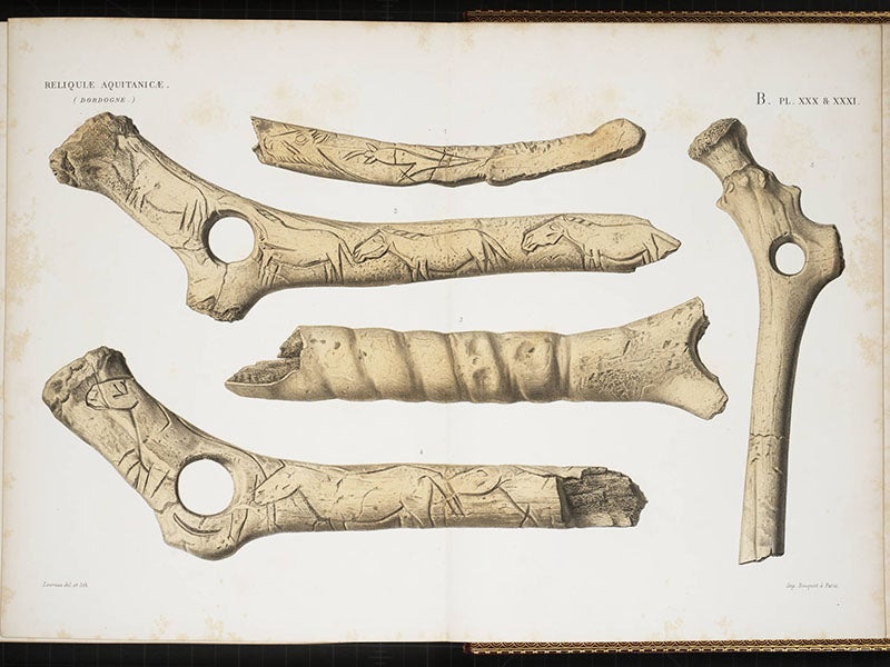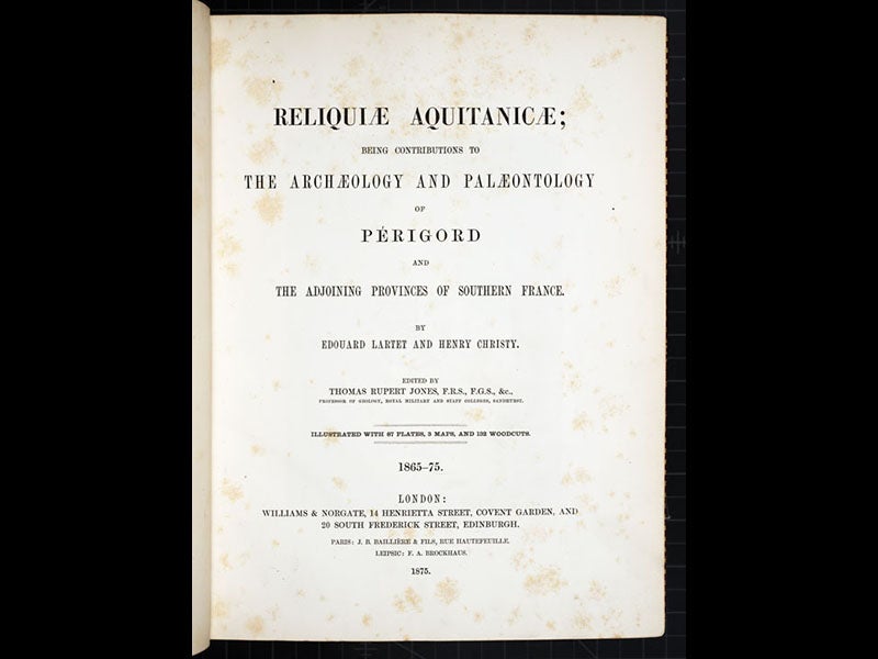 Christy died in 1865, but funding from his estate kept Lartet and his excavations going. Lartet himself died in 1871, but the project now had momentum, and in 1875, Reliquiae Aquitaniae emerged from the press, one of the most attractive books on archaeology ever published (third image). It is Christy’s most impressive legacy. We have a splendid copy in our History of Science Collection, and we displayed it in our 2012 exhibition, Blade and Bone: The Discovery of Human Antiquity, where the lovely La Madeleine mammoth graces the exhibition title page.