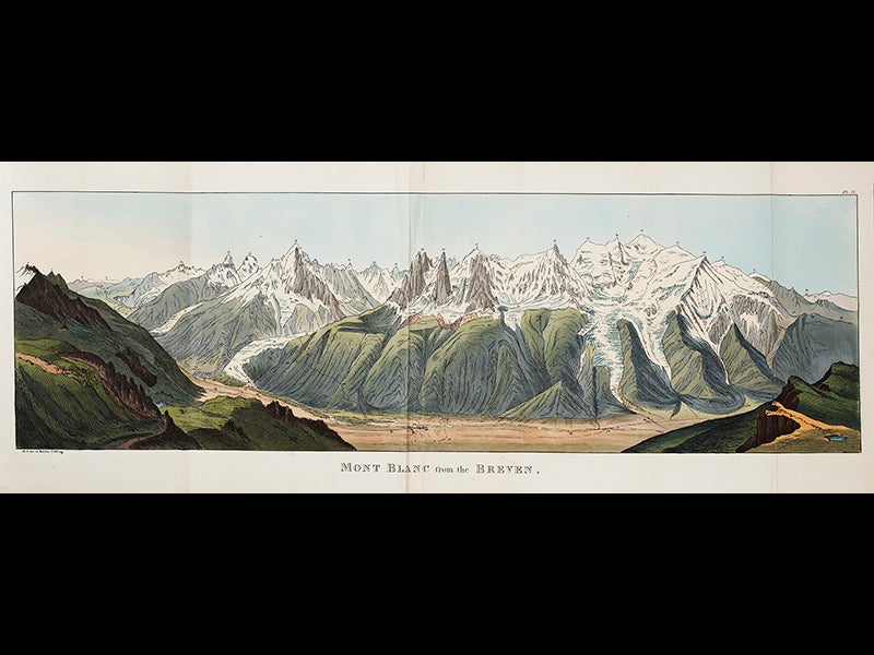 Henry De la Beche, an English geologist, was born Feb. 10, 1796. He travelled extensively in his younger years and made geological sketches of the places he visited, for he was a skilled artist. In 1830, he published Sections and Views Illustrative of Geological Phaenomena, which he illustrated from his own drawings. And perhaps because he liked rocks and stones, he was an early convert to lithography, and all of the prints in this work are lithographs that De la Beche executed himself. As you can see, he preferred fairly simple crayon-pencil drawings, although he was quite capable of more textured work when it was appropriate, as the colored view of Mont Blanc above indicates. The other illustrations above show the island of Staffa in the Outer Hebrides, home of Fingal’s cave, and the crater of Vesuvius. The title page is lithographed as well.