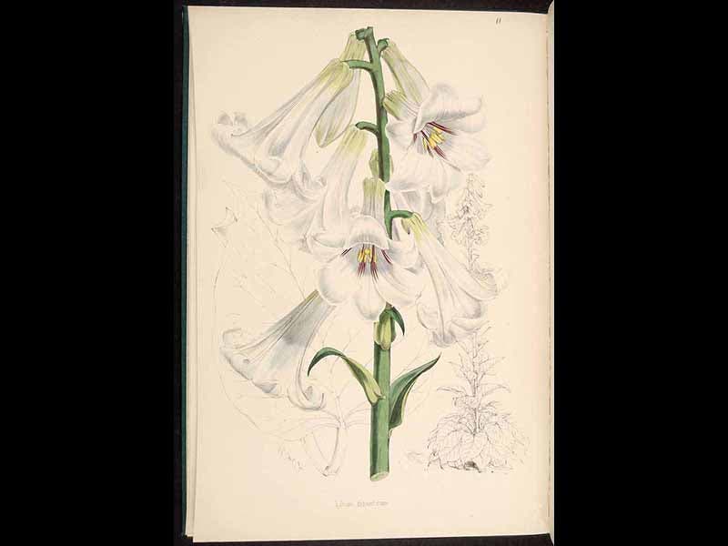 Henry John Elwes, an English botanist and world-traveler, was born May 16, 1846. Elwes began travelling at an early age, and as his family was well-to-do, he doesn't seem to have spent much time in gainful employment, aside from five years in the Scots Guard. At first he collected insects, but on a visit to the Middle East he took an interest in bulbs, the botanical variety, and when he eventually inherited the family estate of Colesbourne in Gloucestershire in 1891, he would make it the bulb paradise of England. Meanwhile, from 1877-80, he issued in parts his Monograph of the Genus Lilium. This folio-sized work contained 50 large lithographs of lilies, executed by the virtuoso botanical illustrator Walter Hood Fitch, and beautifully hand-colored. We have a complete set in the History of Science Collection, still in the original 7 parts, although the title pages of the individual parts were not retained. But our set has not been digitized, so the first five images above were taken from the online version of the Missouri Botanical Gardens Library.