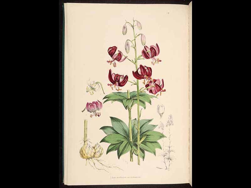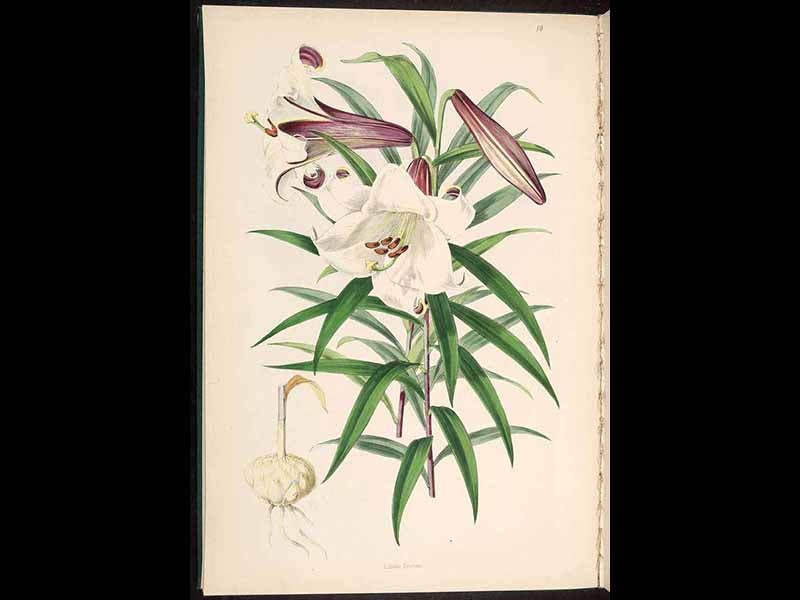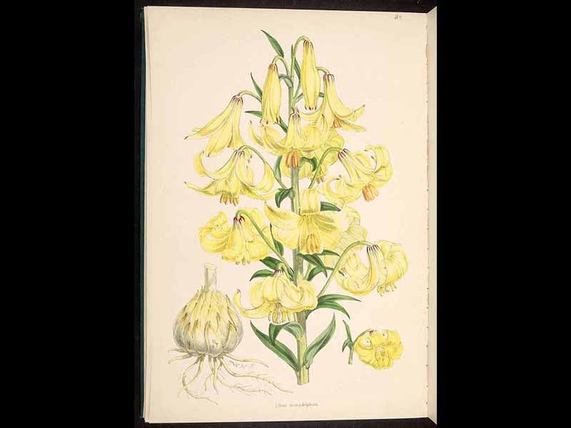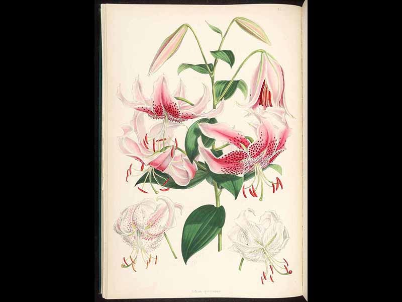 Henry John Elwes, an English botanist and world-traveler, was born May 16, 1846. Elwes began travelling at an early age, and as his family was well-to-do, he doesn't seem to have spent much time in gainful employment, aside from five years in the Scots Guard. At first he collected insects, but on a visit to the Middle East he took an interest in bulbs, the botanical variety, and when he eventually inherited the family estate of Colesbourne in Gloucestershire in 1891, he would make it the bulb paradise of England. Meanwhile, from 1877-80, he issued in parts his Monograph of the Genus Lilium. This folio-sized work contained 50 large lithographs of lilies, executed by the virtuoso botanical illustrator Walter Hood Fitch, and beautifully hand-colored. We have a complete set in the History of Science Collection, still in the original 7 parts, although the title pages of the individual parts were not retained. But our set has not been digitized, so the first five images above were taken from the online version of the Missouri Botanical Gardens Library.