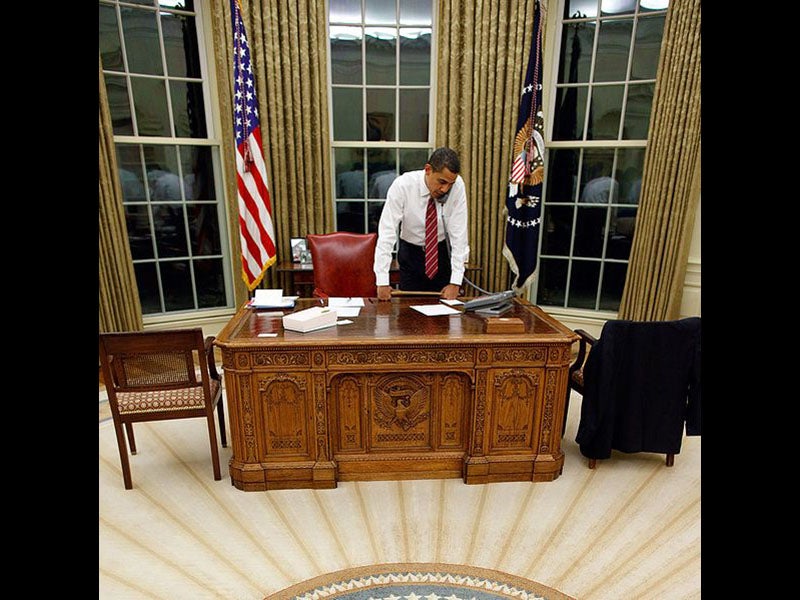 The Resolute froze in as well (fourth image), and in 1854, Commander Belcher ordered Kellett to abandon his ship, over Keller's strenuous protests that the ship would come free next summer. Belcher abandoned his own ship as well (fifth image), and all the crews returned to England on a supply boat. Kellett was proved correct when, the next year, the Resolute freed itself and drifted out into Baffin Sound, where it was found by an American whaler. After being refurbished, the ship was returned to England in 1856, in a great show of brothers-across-the-sea. When the ship was broken up decades later, Queen Victoria had some of the timber fashioned into a desk, which was given to the United States as a present in a return show of affection. The Resolute desk still sits in the Oval Office of the White House (sixth image).