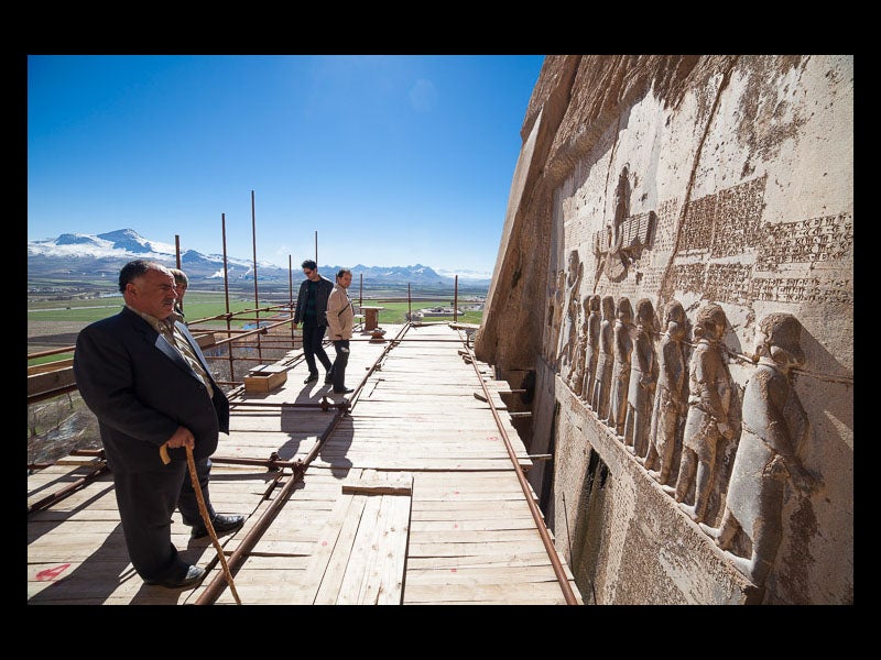 Rawlinson himself climbed to the bottom of the rock carving and transcribed the lower inscriptions, the ones in Old Persian and Elamite (it may be Rawlinson who is standing on the ledge in Coste’s 1839 drawing). The Babylonian inscription at the top was inaccessible, at least to Rawlinson, so he hired a Kurdish youngster to climb up and make papier-māché casts of the cuneiform text. In a modern photo, made with the help of scaffolding, one can see the Babylonian cuneiform at top right (fourth image). With the casts and the transcriptions, Rawlinson and several colleagues were able to decipher first the Old Persian, and ultimately the Babylonian.