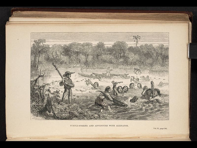Bates’ narrative on his adventures in South America, The Naturalist on the River Amazons (1863) has always been a best-selling traveler’s adventure book; we have a copy in the History of Science Collection, and it is sprinkled with attractive engravings, some of which we include above. The first four images depict, in order: fishing for turtles with an alligator intruder; the primeval forest; a great anteater fighting with a dog; and a wedding feast and dance of the Tucúna natives. Because Bates was of low birth, no one at the National Portrait Gallery in London made any effort to collect portraits of Bates; all they have is one photogravure taken of him when he was an old man (fifth image). Fortunately we have the frontispiece of his book (sixth image), which depicts Bates in action, as I am sure he would prefer to be remembered.