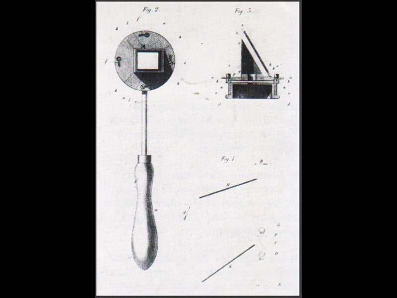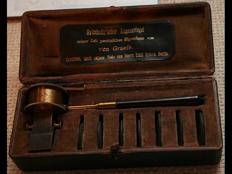 In the early 1850s, Helmholtz began working in the field of physiological optics. Almost all students of optics before Helmholtz defined the field as geometrical optics, and they did ray-tracing and looked for focal points and the like. Helmholtz was interested in the question of how we form an image in the brain from sensory perceptions in the eye; how, for example does the brain fuse two upside-down images from two eyes into one right-side-up image in the mind. He was one of the first to argue that we have to learn how to see, using what he termed a process of “unconscious inference,” and he understood the importance of optical illusions in helping us understand how the mind learns to put together a picture. Since he was interested in the physiology of the eye, he invented an instrument in 1851 that allowed one to look into the eye--the ophthalmoscope, a hand-held instrument with a half-silvered mirror that directs an external light into the patient’s eye and then back through the instrument into the eye of the observer. You have all seen a modern version of an ophthalmoscope at work during your annual physical. An original Helmholtz ophthalmoscope of 1852 can be see here above (second image), as well as a diagram showing the 45° half-mirror (third image). We have his Handbuch der physiologischen Optik (1867) in our History of Science Collection, as well as Über die Die Erhaltung der Kraft.
