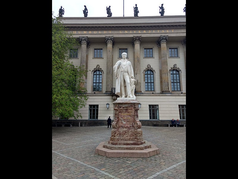 The Humboldt University in Berlin has two handsome statues of its namesakes, Wilhelm and Alexander von Humboldt, in front of the main building, but they are outside the wrought-iron fence, depicted sitting down, and positioned off to the left and right sides. Inside the fence, right smack in front of the main entrance, is a large standing statue of Helmholtz (fourth image). They are obviously proud of Helmholtz in Berlin, as they should be. The only reason one might prefer the 1881 oil portrait by Ludwig Knaus (first image) is that it depicts Helmholtz the experimentalist, holding an ophthalmological lamp, next to a table loaded with instruments, including an ophthalmoscope.