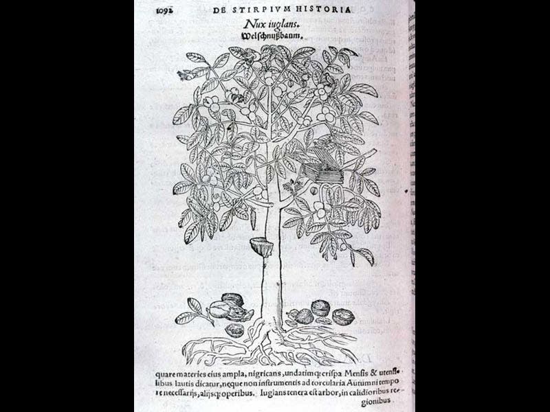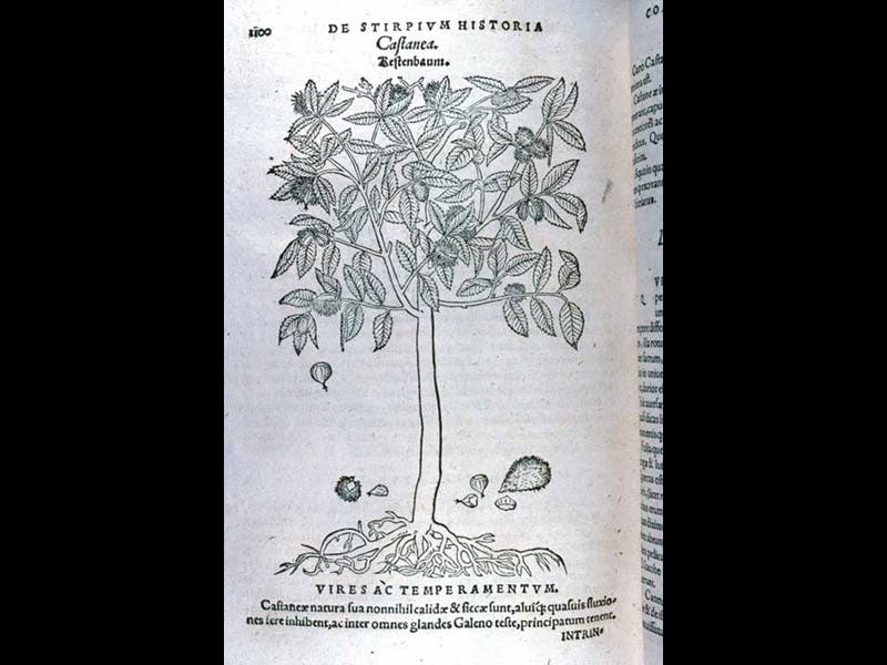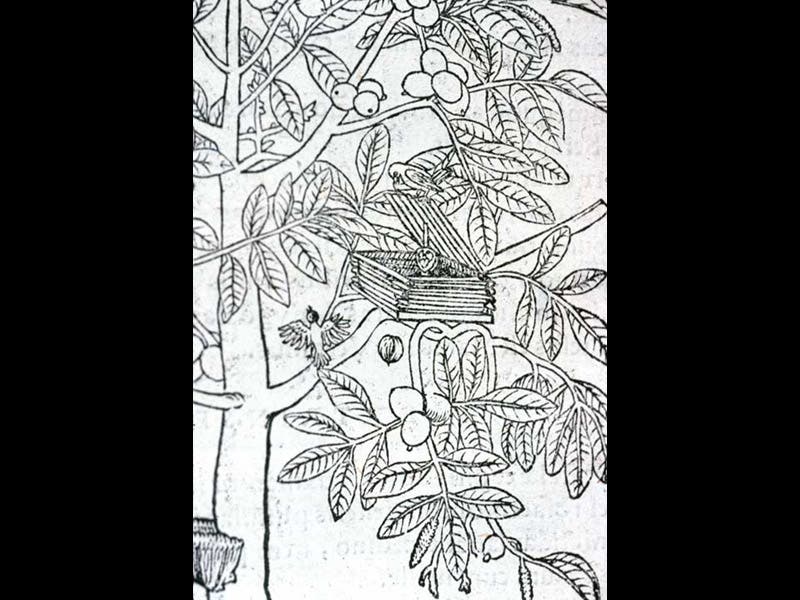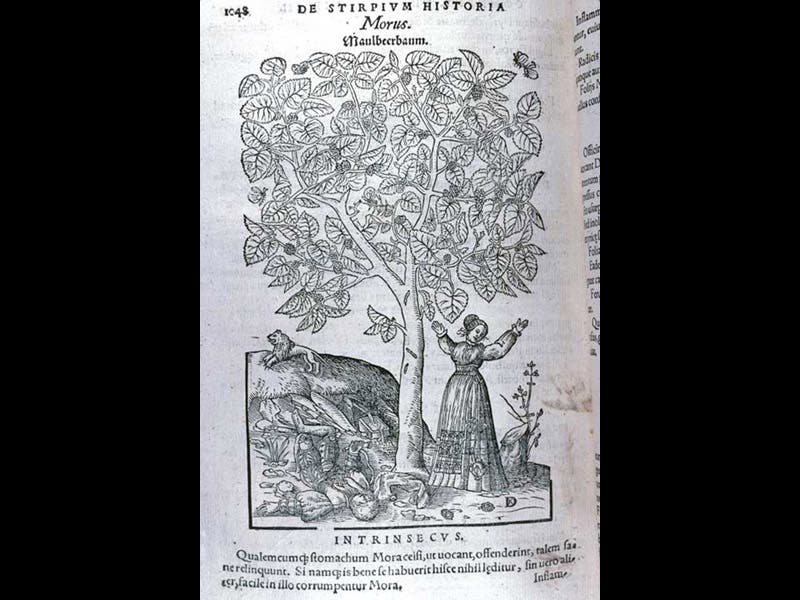 For the 1546 edition of Bock’s herbal, now called De stirpium (On plants), woodcuts were added, by the artist David Kandel. The flower illustrations were mostly copied from those of Brunfels or Fuchs, but in the section on trees, Kandel carved his own path (since Brunfels and Fuchs depicted few trees), displaying a botanical whimsy that has seldom been equaled. The woodcut of a chestnut shows chestnuts in their spiny shells lying on the ground, along with a hedgehog, who looks much like a larger-size chestnut (third image). The woodcut of a mulberry plays out, underneath the tree, the entire story of Pyramis and Thisbe, whose tragic deaths were supposed to have turned the fruit of the mulberry blood-red (fourth image). And the illustration of a walnut tree gave Bock (or Kandel) the chance to include, buried amidst the foliage, a bird trap, just like the ones you used to make with a cigar-box and a pencil (second image). You will note, in the detail, that the intended victim perches just above, on the lid, defiantly untrapped (first image).