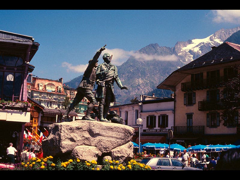 There is a statue in Chamonix, now a prominent winter sports town, that shows Balmat pointing the way up the mountain to Saussure (fourth image). The last image shows the title page of volume 4 of the Voyages, which contains the account of the ascent.