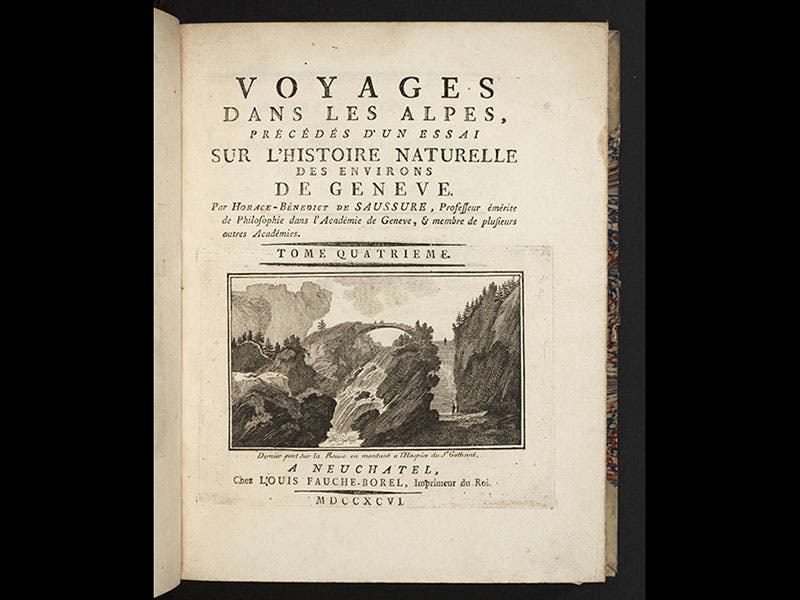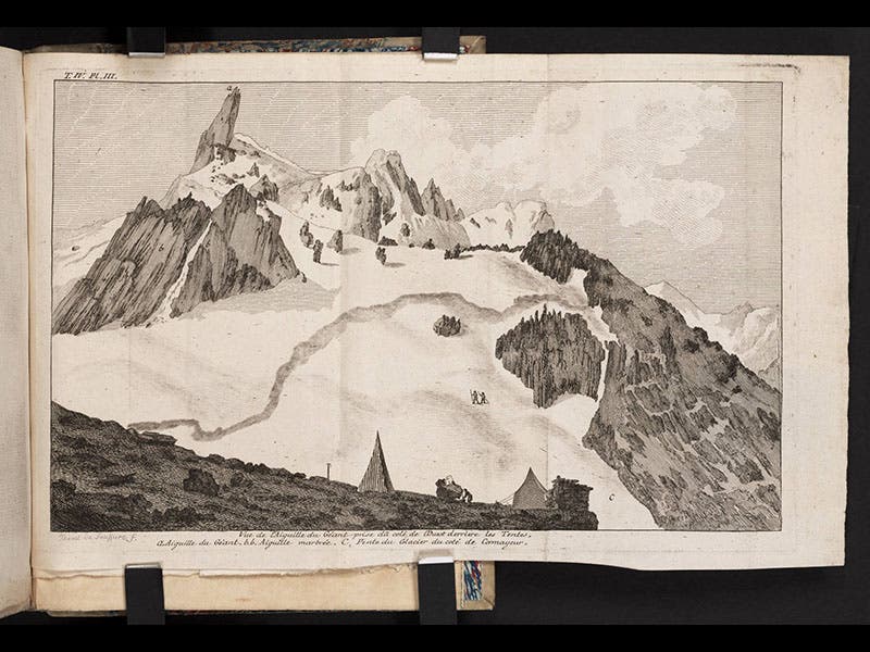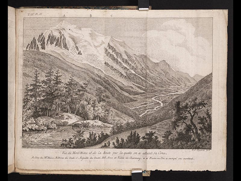 Saussure had already published two volumes of his Voyages dans les Alpes (1779-1796) before he climbed Mont Blanc, but in the two volumes that came later he included material about the adventure, including several views of Mont Blanc that show the path of the ascent (see first three images above). We have the four-volume set in our Collections.