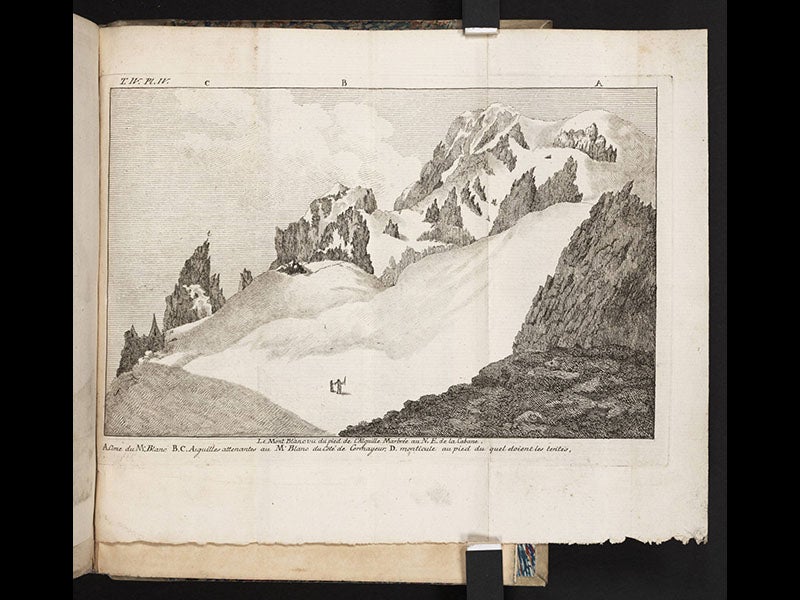 Saussure had already published two volumes of his Voyages dans les Alpes (1779-1796) before he climbed Mont Blanc, but in the two volumes that came later he included material about the adventure, including several views of Mont Blanc that show the path of the ascent (see first three images above). We have the four-volume set in our Collections.