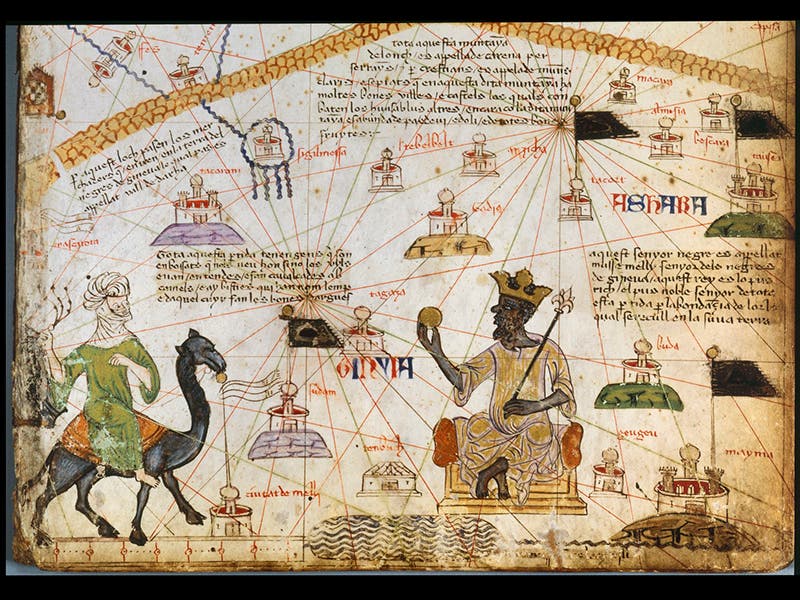 Perhaps the most impressive leg of his travels was his last one, across the Sahara and down into West Africa and the kingdom of Mali, crossing 1000 miles of desert in the process. When he finally returned to Morocco in 1354, he dictated a narrative of his travels, which is known as the Rihla, or Journey, of Ibn Battuta. It survived in a number of manuscripts, but hardly anyone noticed until the French found several manuscripts in Algeria in the 19th century and translated the Rihla into French. On the famous Catalan Atlas of 1375 (see the second image above for the Mediterranean and African section of this map), it is thought that the figure at the bottom left on the camel is Ibn Battuta (see the first image above for a detail), travelling to see the great Mali leader, Mansa Musa (a chronological impossibility, since the two were not quite contemporaneous).