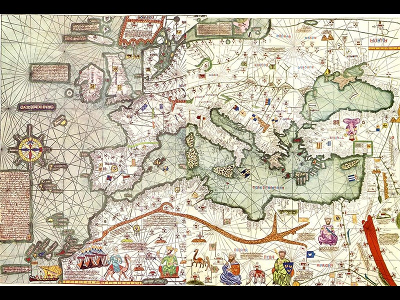 Perhaps the most impressive leg of his travels was his last one, across the Sahara and down into West Africa and the kingdom of Mali, crossing 1000 miles of desert in the process. When he finally returned to Morocco in 1354, he dictated a narrative of his travels, which is known as the Rihla, or Journey, of Ibn Battuta. It survived in a number of manuscripts, but hardly anyone noticed until the French found several manuscripts in Algeria in the 19th century and translated the Rihla into French. On the famous Catalan Atlas of 1375 (see the second image above for the Mediterranean and African section of this map), it is thought that the figure at the bottom left on the camel is Ibn Battuta (see the first image above for a detail), travelling to see the great Mali leader, Mansa Musa (a chronological impossibility, since the two were not quite contemporaneous).