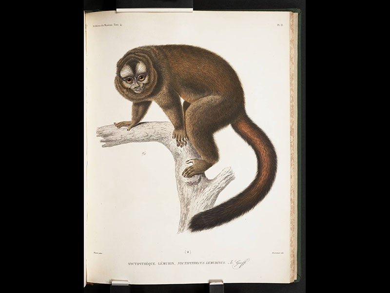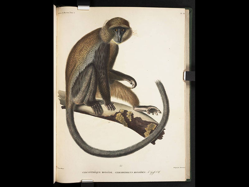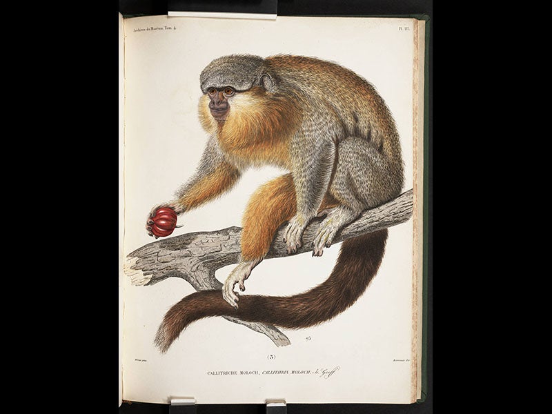 The illustrations above, taken from various articles by Geoffroy Sainte-Hilaire in the Archives, depict, in order: a gibbon, a lemur, a guenon, and a callithrix. We exhibited two more of his illustrations, showing a gorilla and a chimpanzee, in our Grandeur of Life Exhibition in 2009.