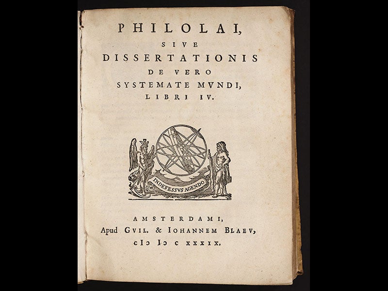 When he compiled the Philolai, Boulliau had not yet discovered Kepler, but by the time he wrote the Astronomica philolaica (1645), he had become an ardent Keplerian, meaning he subscribed to elliptical solar orbits and Kepler’s planetary laws. This second book is a large folio, in contrast to the petite Philolai, and we have it in our collection as well, although no images have been digitized. The world "Philolaus" in both titles refers to the ancient Pythagorean who first proposed that the earth is a planet. Note from the title page of the Philolai (fourth image) that it was published by Willem and Joan Blaeu; Joan was featured here just last week.
