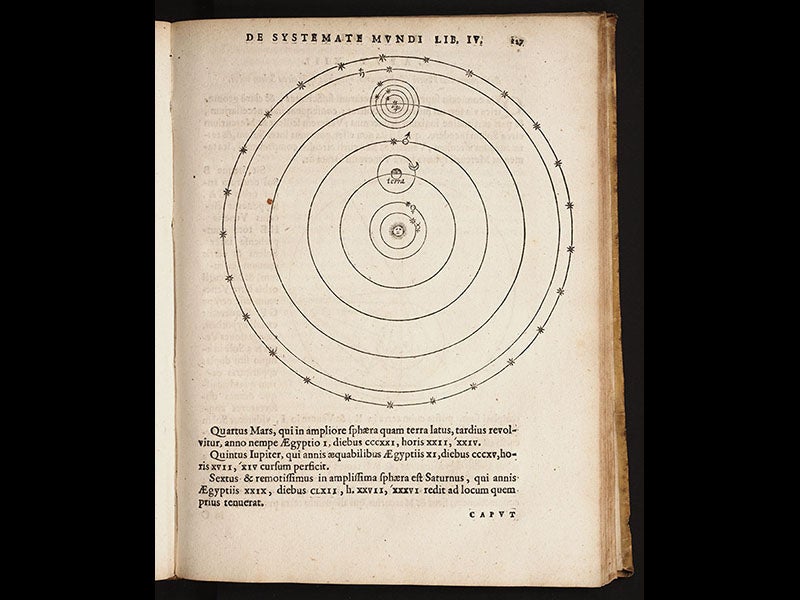 Boulliau was also an ardent Copernican, which was not all that rare in the 1640s, but still, the number of pro-Copernican treatises published before 1660 was relatively small. Boulliau published two of them. The first, Philolai, sive, dissertationis de vero systemate mundi (Philolaus, or a dissertation on the true system of the world, 1639), was a modest octavo volume, but Boulliau made his cosmological position quite clear. Early in the book he inserted a woodcut showing the orbs of the innermost planets and the Sun as they must be if all these bodies orbit the earth (first image), and the chapter title says: “The ancient system of the Syntaxis (Ptolemy’s Almagest) demonstrated to be absurd, if not impossible.” Later he introduces a woodcut of the heliocentric system of Copernicus (second image), which he labels: “The true system of the world.”