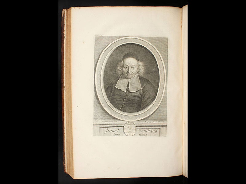 A pamphlet of Boulliau's that we do not have is his Ad astronomos monita duo (Two notices to astronomers, 1667), in which he disclosed that mira Ceti, that mysterious star in the constellation of the Whale that often disappears from view, is actually a "periodic variable" star, meaning that its change in brightness is regular and cyclical, and he measured its period as 333 days, which is very close to the modern value. This was the first periodic variable ever identified and measured. Boulliau lived to be 89 years old and was still publishing mathematical treatises right up to his death in 1694. The portrait above (third image) was published two years after he died, in a portrait book that we have in our collection.