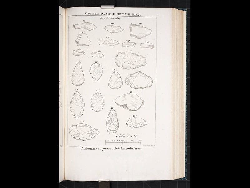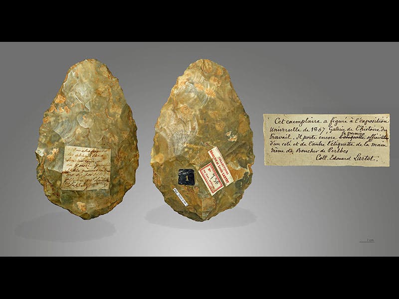 Wikipedia has a photo of an actual tool collected by Boucher de Perthes, which then passed into the collection of the noted archaeologist Edouard Lartet (first image). The caption does not tell us where the tool now resides; it might be in the Museum Boucher de Perthes in Abbeville, or possibly in the Musée de l'Homme in Paris. But it is a lovely artifact, with the original identifying labels of both Boucher de Perthes and Lartet still firmly attached.