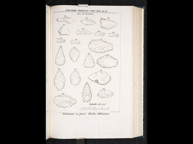 Boucher de Perthes made few converts at the time, primarily because he found no other evidence of human presence along with his supposed tools, nor any remains of the animals those tool-makers must have hunted. It was not until the discovery of Brixham Cave in England in 1858, with its mixture of stone tools and extinct animal remains, that naturalists began to take seriously the notion that humans were ancient inhabitants of this planet. Subsequently, several geologists—including the eminent Charles Lyell—revisited Abbeville and came to realize that Boucher de Perthes had been right all along. A somewhat embittered Boucher de Perthes—he was still very much alive—was only too happy to agree. His book eventually stretched to 3 volumes, completed in 1864; we have the entire work in our collections, and we displayed one volume in our 2012 exhibition, Blade and Bone: The Discovery of Human Antiquity.