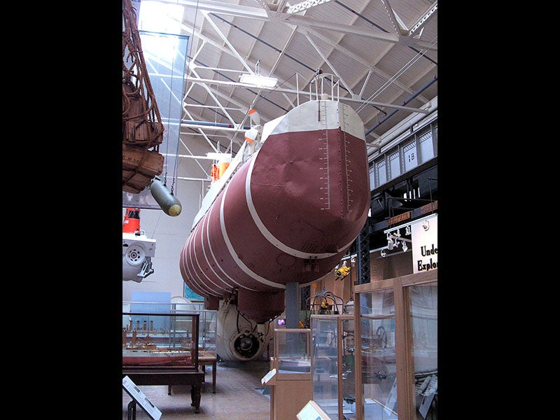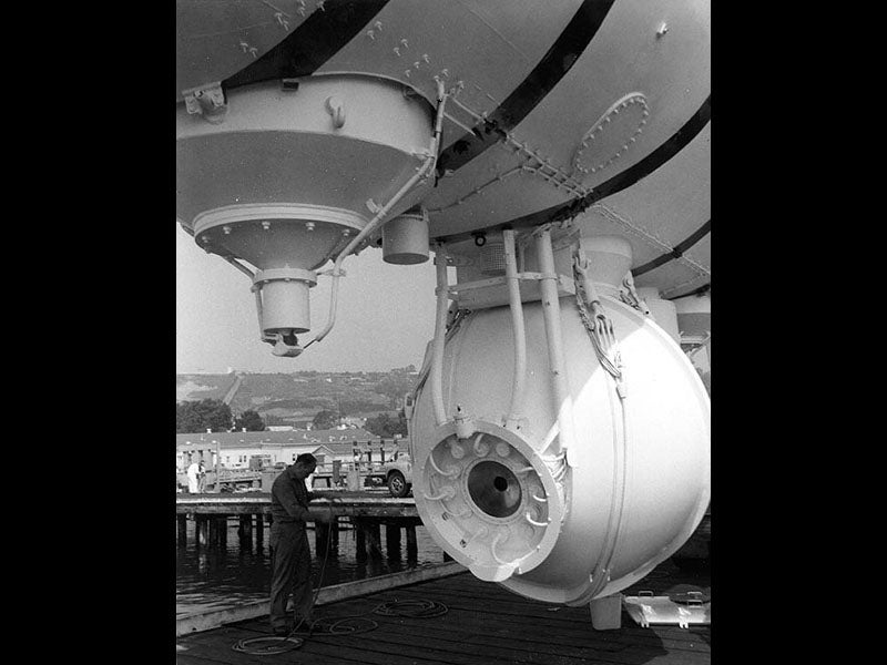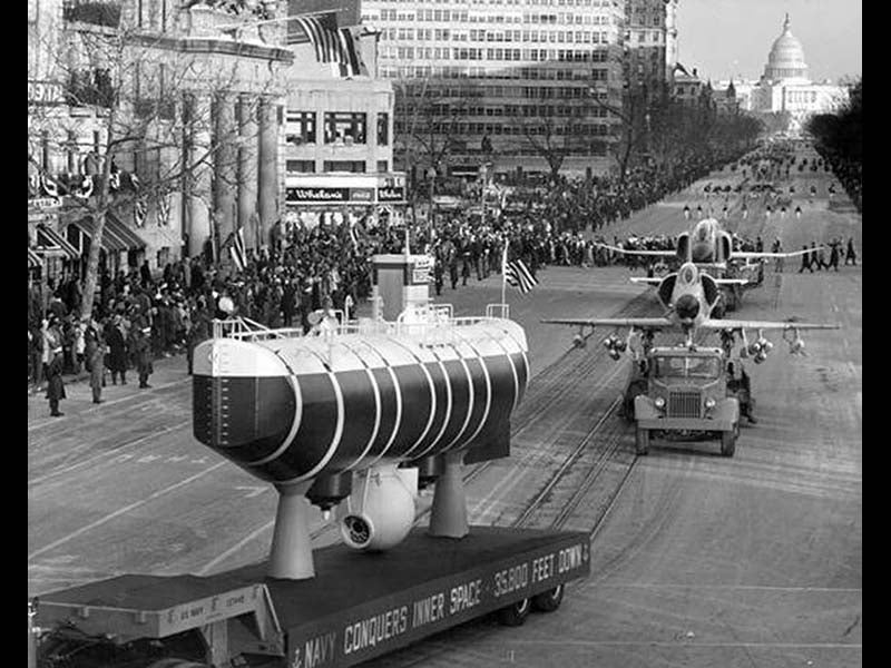 Piccard went on to make other dives in other vessels, and the Trieste went its own way. A full-size replica took part in President Kennedy's inaugural parade in 1961 (fourth image). After being retired, Trieste was restored to service in 1963 to look for the lost nuclear submarine Thresher (which it found). Trieste was retired again, and finally ended up in the U.S. Navy Museum in Washington, D.C., where you can see it today (fifth image). Piccard died in 2008, at the age of 86.