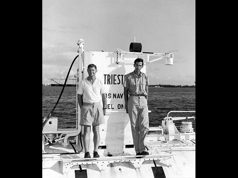 The Trieste was successful in its test runs in the Mediterranean, so it was purchased by the U.S. Navy in 1958, and Jacques went along with his ship as a consultant. On Jan. 23, 1960, Jacques Piccard and a Naval officer, Lt. Don Walsh, took the Trieste down to the bottom of the Mariana Trench in the Pacific Ocean near Guam (third image; Picard is on the right). The Trieste finally settled to the bottom at what Piccard estimated was a depth of 35,800 feet. It is still the deep-dive record, although three subsequent dives have more or less equaled it. It will be hard to exceed, unless we find a deeper trench in the Pacific.