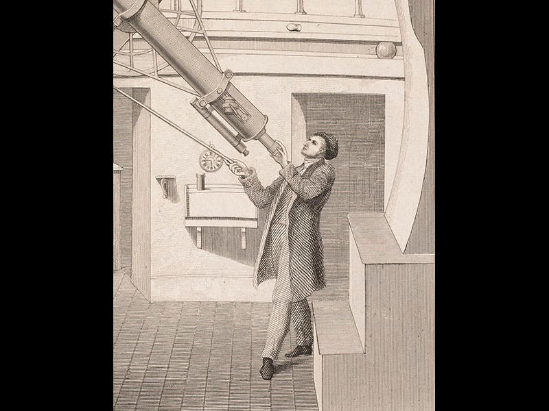 Basire was also often called upon to engrave the telescopes used by these astronomers to observe deep-sky objects. Our first image is a detail of the 5” equatorial refractor of William Henry Smyth, with Smyth at the eyepiece, engraved by Basire for Smyth’s book, Aedes Hartwellianae (1851). We also see a detail of a plate providing 11 views of the large 72” reflector of William Parsons, Lord Rosse, erected in Ireland in 1844 (third image). Rosse’s second most famous discovery made with his Leviathan was the shape of the Crab Nebula, which he named and Basire engraved (fourth image).