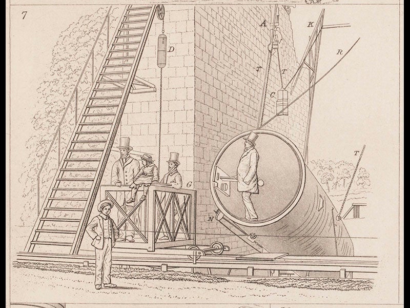 Basire was also often called upon to engrave the telescopes used by these astronomers to observe deep-sky objects. Our first image is a detail of the 5” equatorial refractor of William Henry Smyth, with Smyth at the eyepiece, engraved by Basire for Smyth’s book, Aedes Hartwellianae (1851). We also see a detail of a plate providing 11 views of the large 72” reflector of William Parsons, Lord Rosse, erected in Ireland in 1844 (third image). Rosse’s second most famous discovery made with his Leviathan was the shape of the Crab Nebula, which he named and Basire engraved (fourth image).