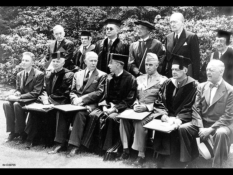 James Bryant Conant, an American chemist, was born Mar. 26, 1893. Conant played a vital role in the Manhattan Project of World War II; many people have heard of J. Robert Oppenheimer, the chief scientist on the Manhattan Project, and some know of his boss, General Groves, but few can tell you who Groves worked for--it was Conant, who was chairman of the National Defense Research Committee, which oversaw the project to build the atomic bomb. Conant came to Washington on loan from Harvard, where he had been president since 1933, and where he single-handedly turned Harvard from a rich-boys school to a major research university. Conant was on the cover of Time Magazine four times: first when he was appointed Harvard President at age 40 (first image above); again when Harvard celebrated its 300th anniversary in 1936 (second image); in 1946, honoring Conant's role in the reform of Harvard (third image); and in 1959, when he was celebrated for his active leadership in reforming American secondary education, especially science education (fourth image). The last image above is a photo taken at the Harvard commencement in 1947; Conant is in the center of the front row, between Gen. Omar Bradley (to the viewer’s right of Conant, and looking nothing like Karl Malden) and Secretary of State George Marshall (who would announce the Marshall plan a few minutes later); T.S. Eliot is next to Bradley, and Oppenheimer is at the far left.
