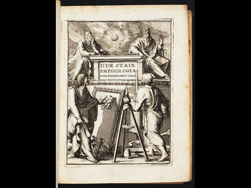 James Dalrymple, 1st Viscount of Stair, a Scottish judge, died Nov. 29, 1695, at age 76 (third image). Stair was one of the most distinguished jurists in Scotland, publishing the Institutions of the Law of Scotland (1681) which is regarded as the foundation of modern Scots law. But Stair was also a natural philosopher of sorts, and in 1686, while seeking political refuge in the Netherlands, he published Physiologia nova experimentalis, whose engraved frontispiece we see above (first image). The continuation of the title is illuminating: …in qua generales notiones Aristotelis, Epicurus, & Cartesii supplementur: Errores deteguntur & emendantur, indicating that the theories of matter of Aristotle, Epicurus, and Descartes are being compared and supplemented, with any errors being pointed out and corrected by Stair. The frontispiece shows us Aristotle and Epicurus at the top, Descartes at the left, and then, unprecedented in the annals of title-page illustration, a fourth individual, an experimentalist, with his back to the viewer. I often use a detail of this figure when lecturing about Robert Hooke, of whom we have no portrait whatsoever, but it is clearly not Hooke who is being represented here, but rather Stair himself--the emendator--who was too modest to have his face included among this trio of intellectual giants.