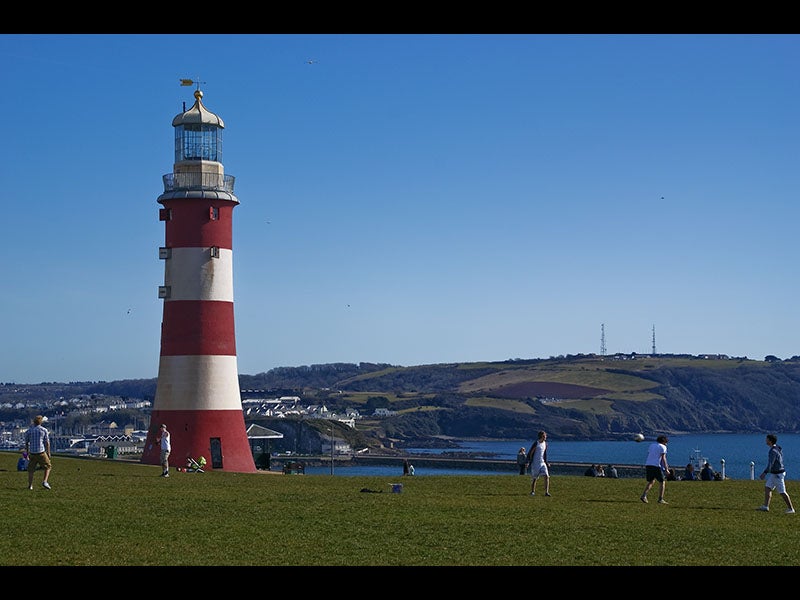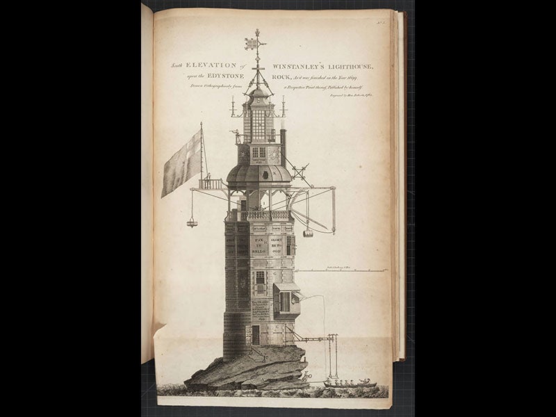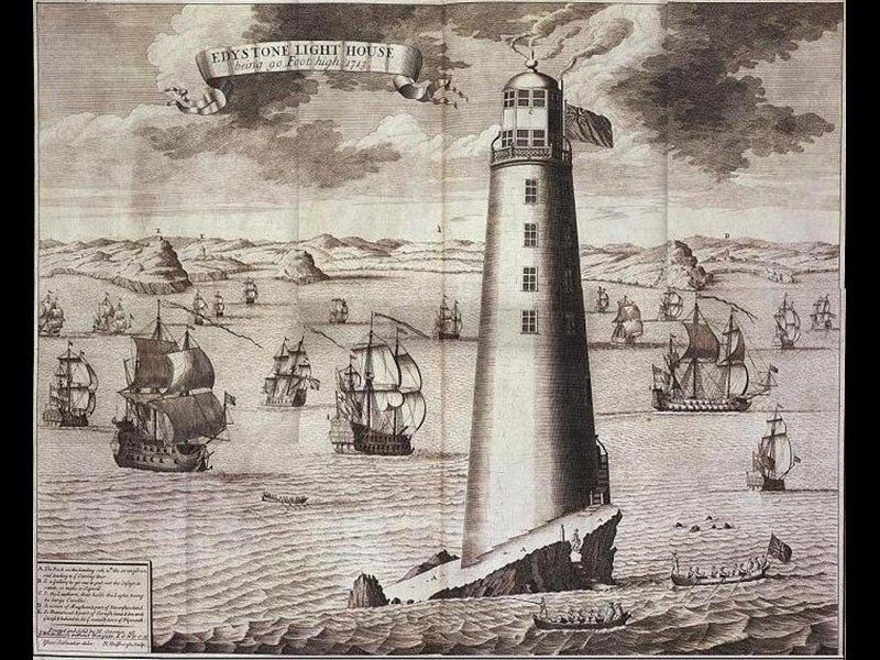 The images above show, in order: the two Eddystone lighthouses of Douglass and Smeaton in 1882, with Douglass’ in the foreground; the first (Winstanley) lighthouse of 1699, which was washed away in 1703; the second (Rudyerd) lighthouse of 1708, which burned down in 1755; the third and most famous Eddystone light, erected by Smeaton in 1759; the fourth lighthouse, that of Douglass, with the stub of Smeaton’s in the background, from a photo of 1905. The last image is a modern photo of the top of Smeaton’s lighthouse, now transported to a green in Plymouth.