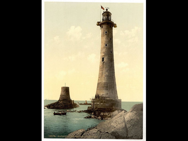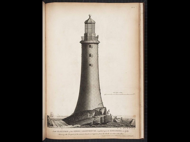 James Nicholas Douglass, an English civil engineer, was born Oct. 16, 1826. Douglass is remembered (or not remembered) as the man who designed and built the "other" Eddystone Lighthouse. The previous and more famous Eddystone light had been engineered by John Smeaton and completed in 1759. This was a big deal, because two previous lighthouses on the same site had been burned or battered into oblivion by the stormy seas in the channel near Plymouth. Smeaton's lighthouse was indeed a beauty, with carefully interlocked stones that could withstand the worst that nature had to offer. However, after 120 years of buffeting by the sea, the rock beneath Smeaton's lighthouse had started to erode away, and it was necessary to build a new structure on a nearby formation of rocks. Douglass was awarded the commission. The new Eddystone light was twice as tall as Smeaton's and much more massive. For a while the two stood there, side by side, but then the top of the old lighthouse was removed and re-erected at Plymouth harbor as a monument. We featured both lighthouses in our Centuries of Civil Engineering exhibition in 2002.