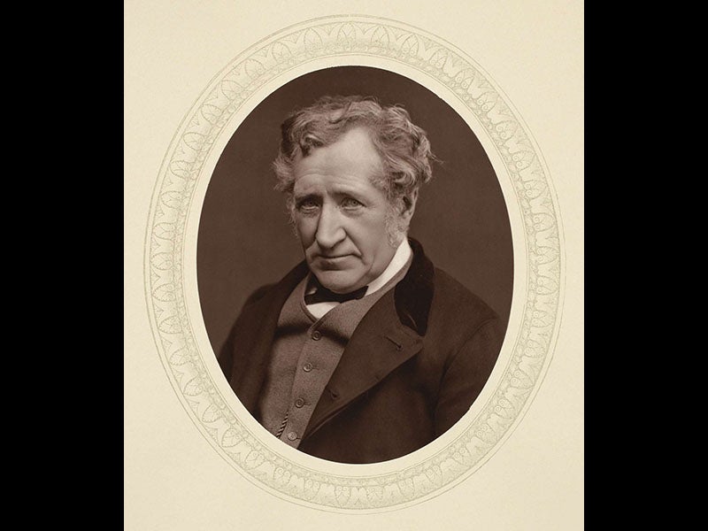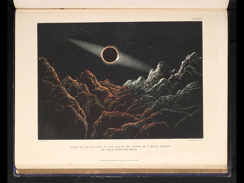 James Hall Nasmyth, a Scottish engineer and inventor, was born Aug. 19, 1808. Nasmyth is best known to historians of technology for inventing, or at least perfecting, the steam hammer, which became indispensable for forging large iron manufactures, and which made him a small fortune. But to historians of astronomy, he is remembered for a remarkable book that he co-wrote with James Carpenter: The Moon: Considered as a Planet, a World, and a Satellite (1874). The book is beautifully illustrated with heliotypes and photographic prints known as Woodburytypes. However, the surprise is that the photographs are not of the moon itself, but of plaster models that Nasmyth built after observing the moon through a telescope. We see three of the Woodburytypes above: the craters Mercator and Campanus (second image); Plato and the Alpine Valley (first and third images), and the crater Copernicus (fourth image), all made from photographs of plaster models. There is also a single chromolithograph, the last plate in the book, that shows an imagined eclipse of the sun as observed from the lunar surface, made from a photograph of a plaster set (fifth image). It looks rather like a matte painting from a 1950s science fiction movie. Even the front cover of the work is classy (sixth image), with a gold-stamped image of an erupting volcano (Nasmyth thought that lunar craters were formed by eruption, rather than impact).