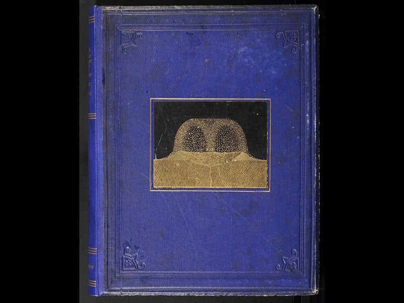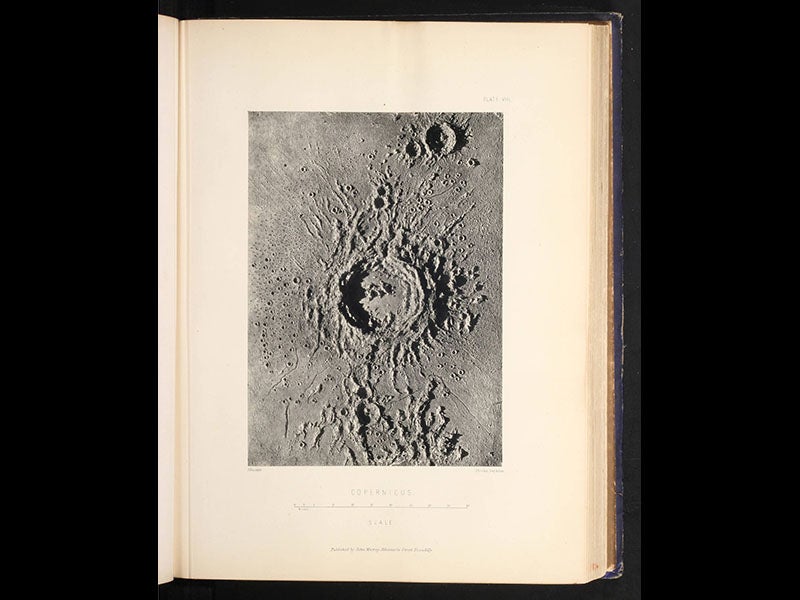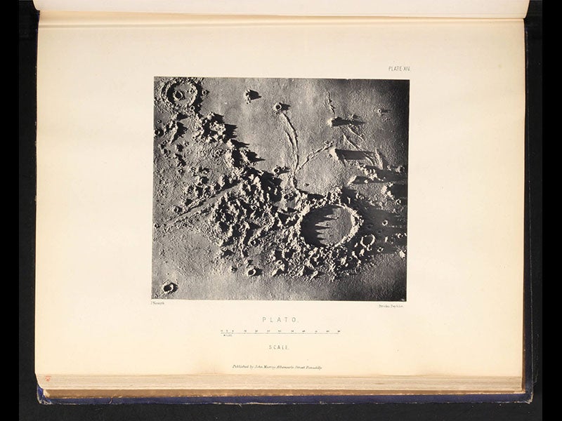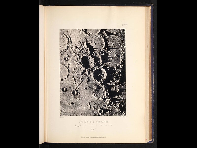 We displayed a second edition of The Moon in our 1989 exhibition, The Face of the Moon, where you can see yet another Woodburytype, depicting the lunar Apennines. We have since acquired three more English editions of Nasmyth’s book, including the first, and two German translations. Interestingly, the illustrations in each one are different (in the second English edition, many of the heliotypes in the first edition have been converted to Woodburytypes), which is why research libraries like to have as many editions as possible of important works like this one.