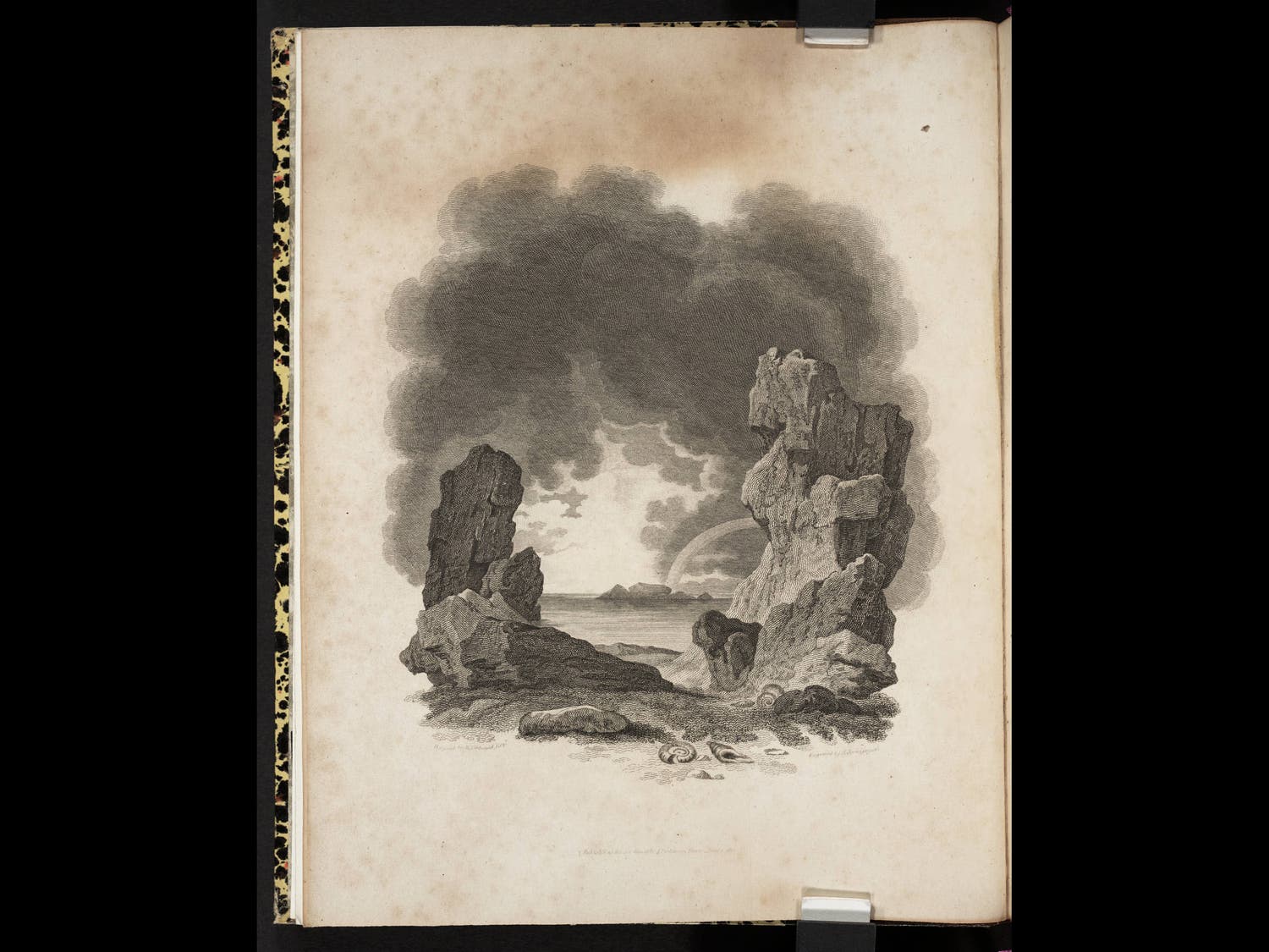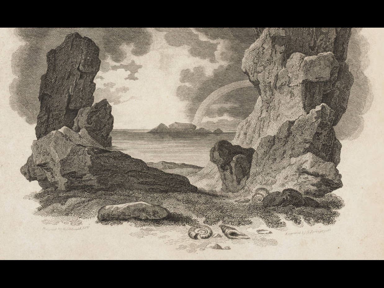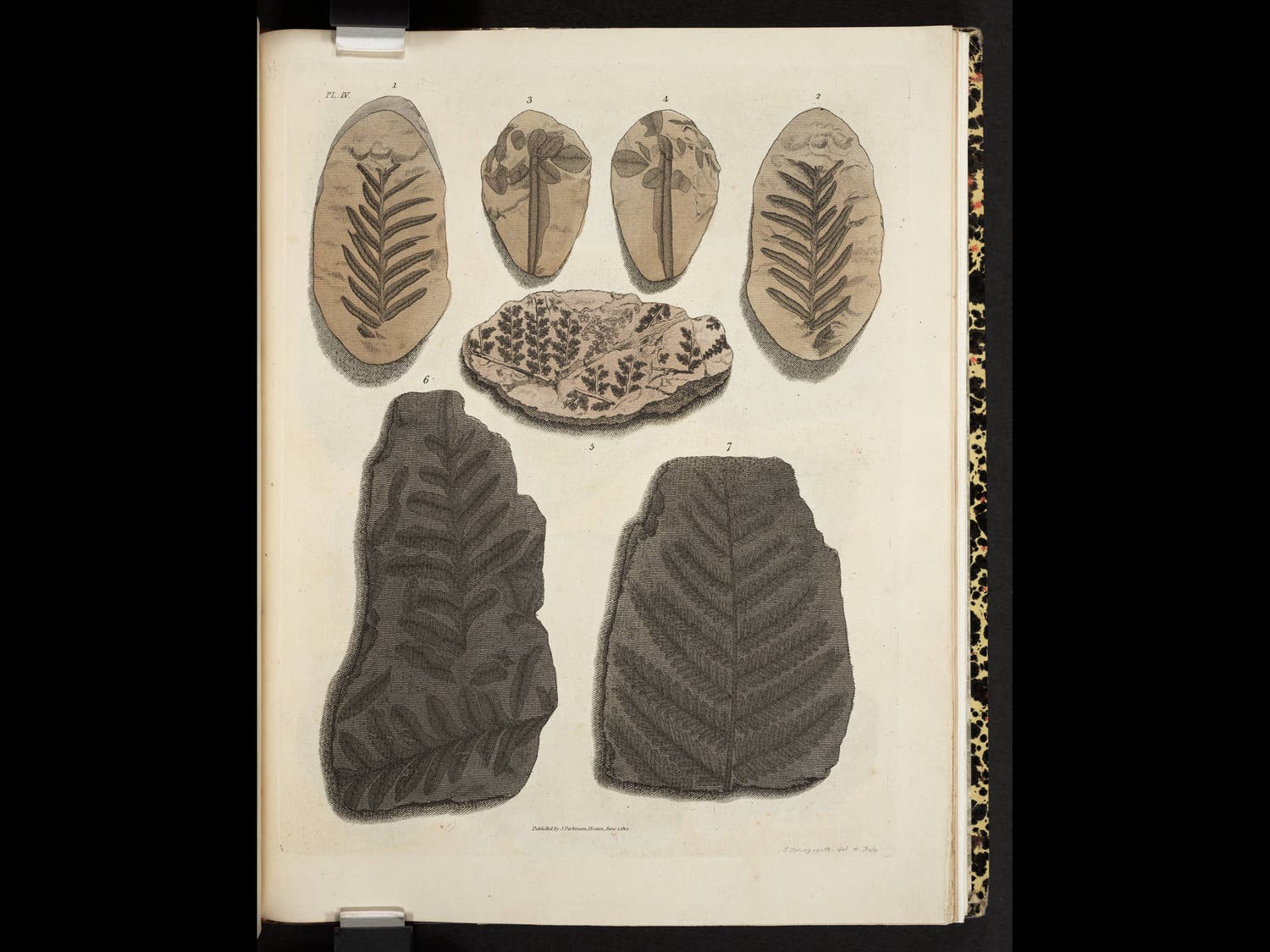 James Parkinson, an English surgeon and ardent collector of fossils, was born Apr. 11, 1755. Between 1804 and 1811, he issued a 3-volume work, Organic Remains of a Former World, to illustrate his collection. The plates show a variety of fossilized plants (first image), a splendid mastodon tooth (second image), and a crinoid that serves as a title-page vignette for all three volumes (third image). As for the origin of his fossils, Parkinson maintained that all fossils had been deposited in the aftermath of the Great Flood of Noah. This position had been common in the early 18th century but was rather rare in Parkinson's time, since most geologists by then had come to realize that one single event could not explain the distribution of fossils in the earth's crust. The frontispiece to Parkinson’s first volume was one of the last visual testaments to "diluvialism," as the “Noah’s Flood” theory of fossil formation was called (fourth image). It depicts a seascape with the Ark coming to rest in the background, while seashells make the transition into fossils in the foreground. The fifth image provides a detail of this charming littoral scene.