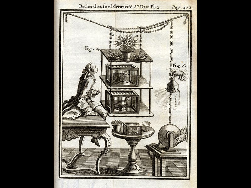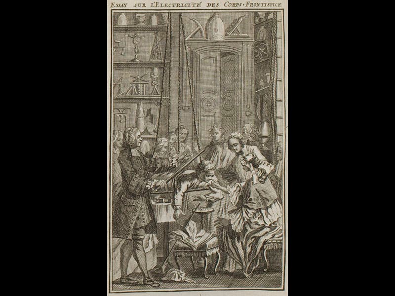 Nollet's textbooks for his experimental lectures remained quite popular for a long time. We have 16 Nollet titles in 18th-century editions in the Library, and our collection is by no means complete. Many years ago, in 1991, we did an exhibition on 18th-century electricity, called To Make a Vain Man Humble, and we had the opportunity to display two Nollet works. His images were great crowd-pleasers, especially the one that shows a young man hanging from the ceiling by cords, in the process of being electrified (third image).