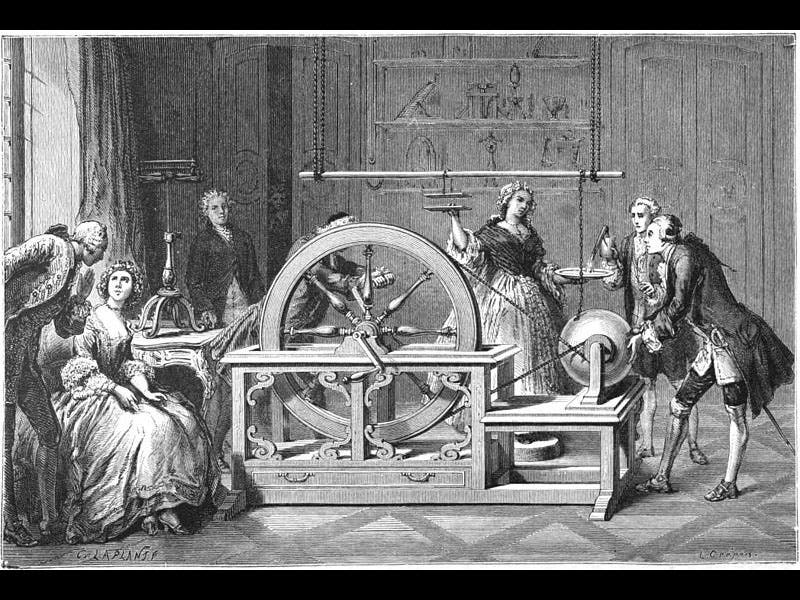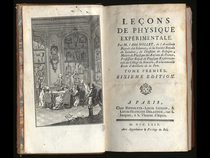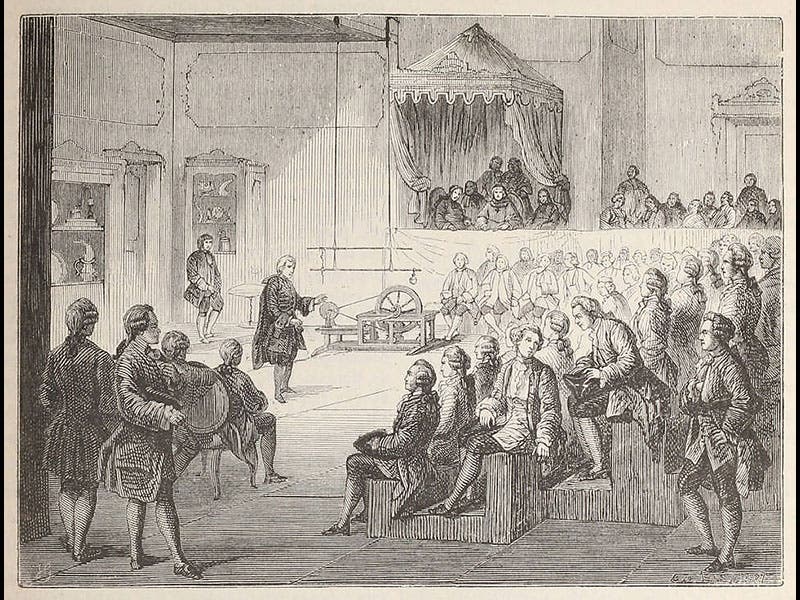 Jean-Antoine Nollet, often called the abbé Nollet, was a French experimental physicist, born on Nov. 19, 1700. Nollet gave an extremely popular lecture course in Paris for many years that was almost entirely devoted to experiments (see first image); he used over 350 pieces of apparatus, most of which he made himself, for his demonstrations. When electrical demonstrations became popular in the 1740s (second image), Nollet was right in the forefront, and he even constructed a grand theory of electricity around 1747 that involved several electrical fluids and various effluvia. Unfortunately, at about the same time, a young printer in Philadelphia, Benjamin Franklin, proposed a quite different theory, involving only one electrical fluid, which accounted much better for such things as the new Leyden jar, so Nollet is remembered as a great electrical experimenter, not as a theorist.