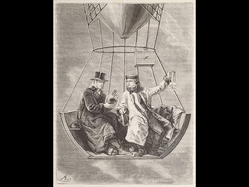 Biot was sent to investigate. Not only did he interview dozens of townspeople, but he studied the chemistry of the fallen stones and then scoured the area, including factories, to see if he could find any kinds of stones or manufacturing products that resembled the meteorites. He could not. Biot returned to Paris and wrote a report in which he ruled out every other possible origin for meteorites except an extraterrestrial one. Modern meteoritics really began with this report. And the reason Biot was convincing is that he produced eye-witnesses and showed that their testimony was reliable. Biot's scientific stock rose dramatically, especially when the very next year he ascended in a balloon with the chemist Gay-Lussac to an altitude of over 4 miles, attempting to see outer space for himself. In the wood engraving above, from a 19th-century book in our collections, Biot is the one on the right (third image).