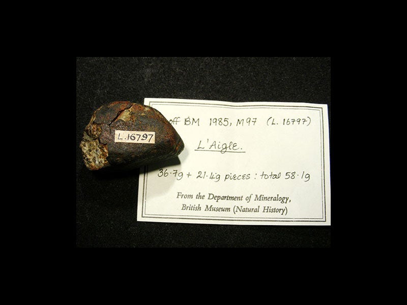 Jean-Baptiste Biot, a French physicist and astronomer, was born Apr. 21, 1774. In Biot's day, the extraterrestrial origin of meteorites was a hotly-debated topic. Ernst Chladni in 1794 had first proposed the idea that meteorites come from outer space, but many preferred to believe that meteorites were either the explosive products of volcanic eruptions, or concretions that formed in the atmosphere, like hail. On Apr. 26, 1803, reports came out of a small French town called L'Aigle that a rain of stones had fallen from the sky. We see above photographs of two of the 3000-odd meteorites that were collected that day (first and second images).