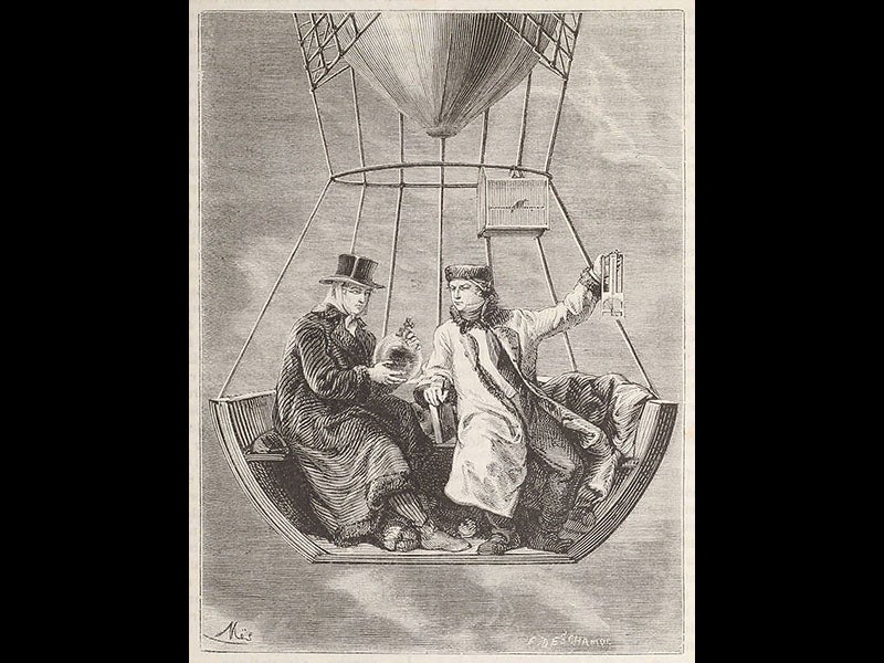 Biot was sent to investigate. Not only did he interview dozens of townspeople, but he studied the chemistry of the fallen stones and then scoured the area, including factories, to see if he could find any kinds of stones or manufacturing products that resembled the meteorites. He could not. Biot returned to Paris and wrote a report in which he ruled out every other possible origin for meteorites except an extraterrestrial one. Modern meteoritics really began with this report. And the reason Biot was convincing is that he produced eye-witnesses and showed that their testimony was reliable. Biot's scientific stock rose dramatically, especially when the very next year he ascended in a balloon with the chemist Gay-Lussac to an altitude of over 4 miles, attempting to see outer space for himself. In the wood engraving above, from a 19th-century book in our collections, Biot is the one on the right (third image).