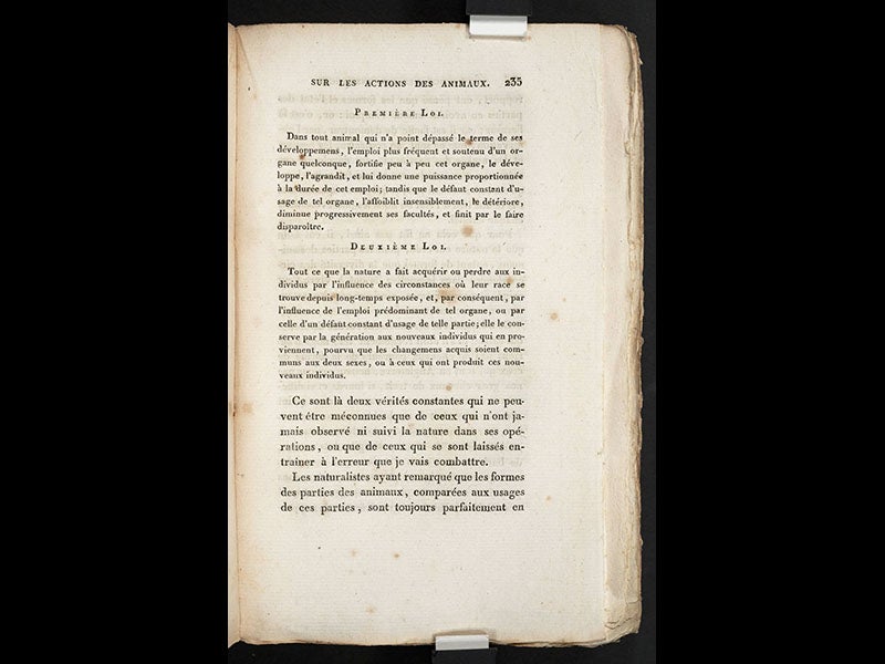 Eight years later, when he was 65, Lamarck published his two-volume Philosophie zoologique (1809; second image), in which he made a case for the transmutation of species, or evolution, as we now call it. He set down two laws of nature that Lamarck thought made evolution inevitable, and, unusually, both laws fit onto one page of his 1809 book (third image). The first law observes that the strength and size of an animal's organs change over the course of its lifetime, as it uses or does not use those organs, and the second law proposes that such modifications are passed on to the next generation. His conclusion was that species should be modified by the inheritance of acquired characters. He even included a diagram at the end of his book to suggest how the evolutionary process had worked itself out (fourth image). Lamarck was the first evolutionist to provide a possible mechanism for evolution, and even though it turns out that acquired characters are not inherited, Lamarck has usually been admired as an important precursor to Charles Darwin.