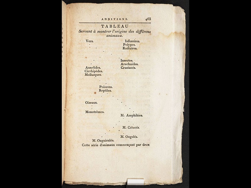 We have copies of both the Histoire...sans vertebres and the Philosophie zoologique in our History of Science Collection. The Zoological Philosophy is an especially fine copy, since it is uncut, in its original wrappers, just as it came from the printers. We displayed it in our 2009 exhibition, The Grandeur of Life. When HMS Beagle embarked on its famous voyage in 1831, the on-board library available to Darwin included a second edition of the Histoire...sans vertebres (an edition we also have in our collections). The Beagle library did not contain Lamarck’s Philosophie zoologique.