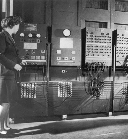 Jean Jennings Bartik, an American computer pioneer, was born Dec. 27, 1924. Having majored in math at Northwest Missouri State Teachers College in Maryville, Jennings was invited by the Moore School of Electrical Engineering at the University of Pennsylvania to join their ENIAC computer group in 1945. ENIAC was the world’s first general-purpose programmable computer. As the division of labor worked itself out, the male engineers took charge of the hardware, and the task of programming the computer was turned over to six women, with Jennings one of the six. They were not quite software engineers, these six females, for the programming was done with wiring boards and punched cards--one might better call them cardware engineers--but they came to understand computer operations much better than their male counterparts. In the first photo of ENIAC above (first image), Jennings, who emerged as a co-leader of the group, is at the left; in the second (second image), Jennings is at the back on the right, her hand on a switch.