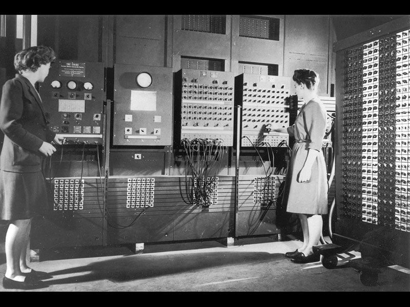 Jennings moved on to work on the BINAC computer, the first to use stored electronic programs, and then the UNIVAC computer, in the late 1940s (third image). For the next thirty years, Jennings (now Bartik) and the other women pioneers were hardly mentioned in computer literature, and captions to the photos of ENIAC that showed the women at work, such as the two above, often described them as "operators," as if they turned switches off and on and did little more, when in fact they were responsible for all the programming. Proper recognition of Jennings’ computer pioneer status came only long after her retirement in 1985. In 1997, she was inducted (along with her 5 women ENIAC colleagues) into the Women in Technology International Hall of Fame, and in 2009, Bartik received a special award from the Computer History Museum in Mountain View, California.