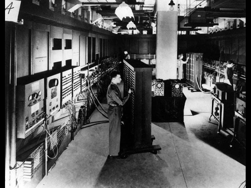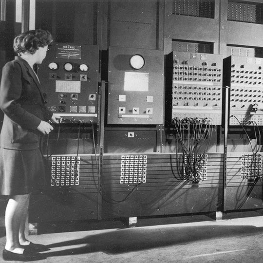 Jean Jennings Bartik, an American computer pioneer, was born Dec. 27, 1924. Having majored in math at Northwest Missouri State Teachers College in Maryville, Jennings was invited by the Moore School of Electrical Engineering at the University of Pennsylvania to join their ENIAC computer group in 1945. ENIAC was the world’s first general-purpose programmable computer. As the division of labor worked itself out, the male engineers took charge of the hardware, and the task of programming the computer was turned over to six women, with Jennings one of the six. They were not quite software engineers, these six females, for the programming was done with wiring boards and punched cards--one might better call them cardware engineers--but they came to understand computer operations much better than their male counterparts. In the first photo of ENIAC above (first image), Jennings, who emerged as a co-leader of the group, is at the left; in the second (second image), Jennings is at the back on the right, her hand on a switch.