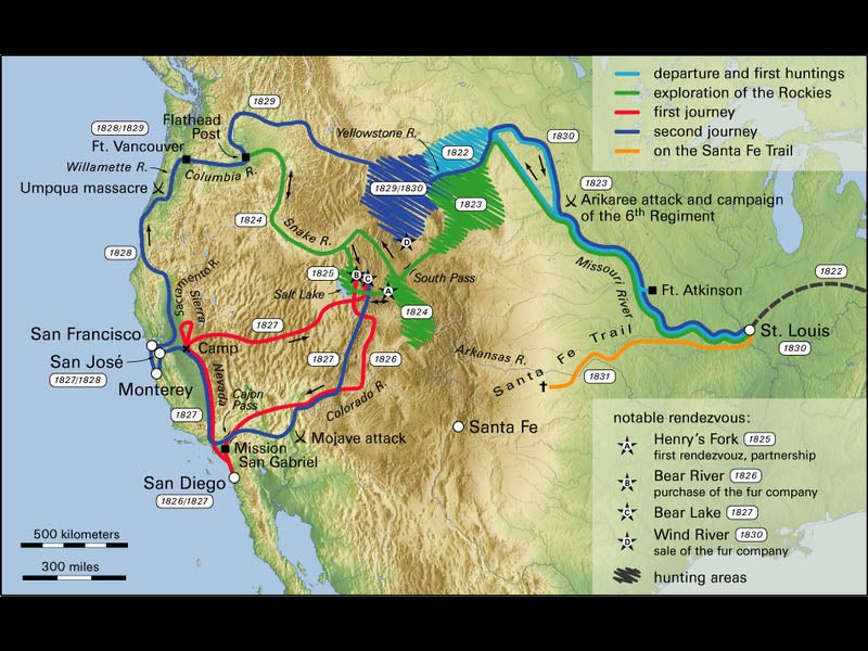 Jedediah Smith, the first of the legendary Mountain Men of the American West, died May 27, 1831. The Mountain Men were primarily trappers and not explorers or naturalists, but Smith deserves mention here because he was the first person who was not a Native American to make it overland to California, first via the Mohave Desert route (1826) and then again across the Sierras (1827); he also journeyed up the California coast to Oregon (1828), and it was Smith who rediscovered the South Pass through the northern Rockies (1824; see third image above), which had been discovered once before and then lost from memory; this would become the primary mountain-crossing avenue for the Oregon Trail. Smith made a map of his travels; the map no longer survives, but it was apparently the basis for several other maps of the 1830s and 1840s, until replaced by the great survey maps of the 1850s. Smith survived three of the four Indian massacres he encountered, and even withstood the attack of a grizzly bear, which left him with a long scar on his face and a re-attached ear. A modern map of Smith's travels is quite impressive (second image). On this map, you will see a little black cross about halfway down the Santa Fe Trail. This is where Smith was attacked and killed by Plains Indians on this day in 1831; he was 32 years old. He has no grave, no monument, and only one statue that we know of, in San Dimas, Ca. (first image). We have done a much better job of remembering and commemorating his successor, Jim Bridger, who has statues all over the West, including one right here in Westport in Kansas City. Dr. William B. Ashworth, Jr., Consultant for the History of Science, Linda Hall Library and Associate Professor, Department of History, University of Missouri-Kansas City. Comments or corrections are welcome; please direct to ashworthw@umkc.edu.