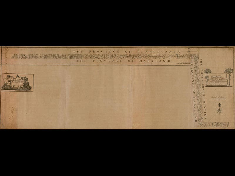 The Mason-Dixon line was published as a map in 1768--a very strange map, as you can see (first and second image above; the second image is a detail of the far right of the map). We do not have the map in our collections. As they laid out the boundary line, Mason and Dixon placed marker rocks every mile. The mile markers had a “P” carved on the Pennsylvania/Delaware side and an “M” on the Maryland side, and a great number of them survive (third image). Every five miles, the duo placed a more elaborate stone--taller, with the family crests of the Penns and the Calverts carved on them. The stones with crests, the ones that have survived, are often protected by small wrought-iron enclosures. The one shown above, placed at the point in central Delaware where the line makes its right angle turn to the east, has the advantage that the two crests are only 90 degrees apart and can be seen at the same time (fourth image).