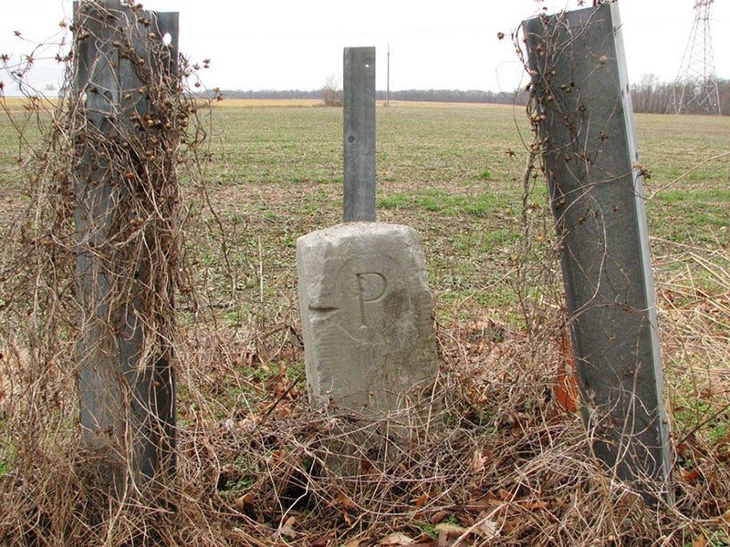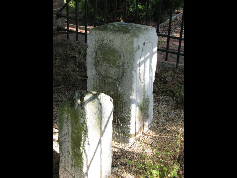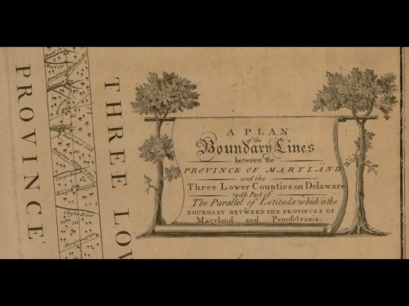 The Mason-Dixon line was published as a map in 1768--a very strange map, as you can see (first and second image above; the second image is a detail of the far right of the map). We do not have the map in our collections. As they laid out the boundary line, Mason and Dixon placed marker rocks every mile. The mile markers had a “P” carved on the Pennsylvania/Delaware side and an “M” on the Maryland side, and a great number of them survive (third image). Every five miles, the duo placed a more elaborate stone--taller, with the family crests of the Penns and the Calverts carved on them. The stones with crests, the ones that have survived, are often protected by small wrought-iron enclosures. The one shown above, placed at the point in central Delaware where the line makes its right angle turn to the east, has the advantage that the two crests are only 90 degrees apart and can be seen at the same time (fourth image).