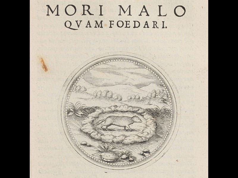 We have chosen our examples today from the volume on quadrupeds. Our first emblem (shown twice, full page (third image) and in detail (first image)) depicts an ermine pacing about inside an enclosure. The ermine knows that when its fur turns white, hunters will try to kill it, and it also knows that if it urinates on its fur, its coat will be ruined and the hunters will look elsewhere, but the personal cost of this desecration would be great. The motto shows the ermine's conclusion: "Mori malo quam foedari"--"better to die than be dishonored". From this time forward, the ermine will represent a moral dilemma--when do we make a stand for our beliefs, and when do we sacrifice them for our continued existence?