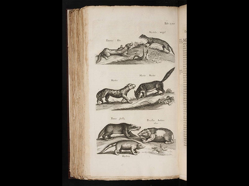 Joannes Jonston, a Polish naturalist descended from a noble Scottish family, was born Sep. 15, 1603. In 1650, Jonston published the initial volume of his Historia naturalis, the first new natural history encyclopedia since Ulisse Aldrovandi began issuing his Natural History in 1599. Jonston’s was one of the first zoological encyclopedias to utilize engravings instead of woodcuts, and the reader is treated to splendid views of badgers and polecats (second image), raccoons and ichneumons (third image), as well as newly discovered South American mammals such as howler monkeys and capybaras (fourth image), and anteaters and sloths (first and fifth images).